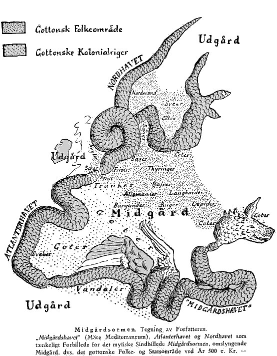 Midgårdsormen, som vi kender ham fra Myten, er norsk-islandsk, og Forestillingen er bleven os så fjærn, så danske Skoledrenge kan høres tale om "Thor og Hvidkålsormen", ligesom andre laver Fenrisulven om til "Fædrelandsulven". Men engang var han et naturligt Fantasiudtryk for det bølgende, blågrå Hav, og det spillede samme Rolle for de gamle Nordboer som den store Søslange for Alverdens Matroser i vore Dage. Og Uhyret spøgte ikke bare omkring Norge og Island, men også ved de nordvestjyske Kyster og i Sallingland, som vi siden skal se. – Som sagt, om den Ting er de Lærde enige, at Midgårdsormen forestiller Verdenshavet, som omslynger Midgård. Dærmed slår man sig imidlertid til Tåls; man tænker sig, at Midgårdsormen er bare Verdenshavet i blå Almindelighed, og Midgård er den Del av Jorden, hvor det boer Mennesker, lige meget hvad Nationalitet de så tilhører. Men jeg tør tage et højt Væddemål på, at der bag det mystiske Sindbillede ligger andet og mere, end de Lærde med deres noget bovlamme Fantasi kan forestille sig. For at skønne det bedes man kaste et Blik på min Figur S. 472, som forestiller Europa ved År 500 e. Kr., opfattet på malerisk-fantastisk Vis. Man vil da se, at Midgårdsormen svarer til en fortsat Kæde av Have, nemlig "Midgårdshavet" (ordret oversat av latinsk "Mare Mediterraneum", ellers kaldet Middelhavet), Atlanterhavet, Vesterhavet og Nordhavet. Og det dærav omslyngede Midgård er ingenlunde hele den av Mennesker indtagne Jordklode, men indskrænker sig væsentlig til det gottonske Område, nemlig: 1. Norden; 2. Tyskland; 3. de gottonske Kongeriger Frankrig (på nær Bretagne), Spanien og Italien. Dærimod næsten alt Land hinsides Midgårdsormen tilhører Udgårds fremmede, ikke-gottonske Folk; der er først hele Vestasien, næsten hele Afrika, dærnæst det halve England, næsten hele Skotland og endelig hele Irland. Således tolket bliver det gamle Sindbillede først for Alvor forståeligt for os; det får Dybde og nationalt Indhold. Nu vil naturligvis een og anden kritisk Anmelder komme og sige: hvordan skulde dog de gamle Nordboer uden Verdenskort og uden luftfotografiske Fugleperspektivbilleder og uden Dr. Schüttes etnologiske Håndbog "Vor Folkegruppe Gottjod" have haft Rede på Landenes Form og alle Europas Indbyggere og deres Nationalitet! Men jeg vover at hævde, at disse gamle Hedningers etnografiske Kundskab var langt større, end vi drømmer om. Folkevandringstidens livlige Samfærdsel i alle Verdenshjørner havde gjort Folk geografisk interesserede, og Kvadet "Widsith" viser, at Angelsaxerne i 6. Århundrede kendte Navne på Folkefærd lige fra Finmarken til Syrien og Saracenien. Der er intet, der forbyder os at antage, at sådanne Erfaringer kunde bundfælde sig i et mytisk Sindbillede som Midgårdsormen.
